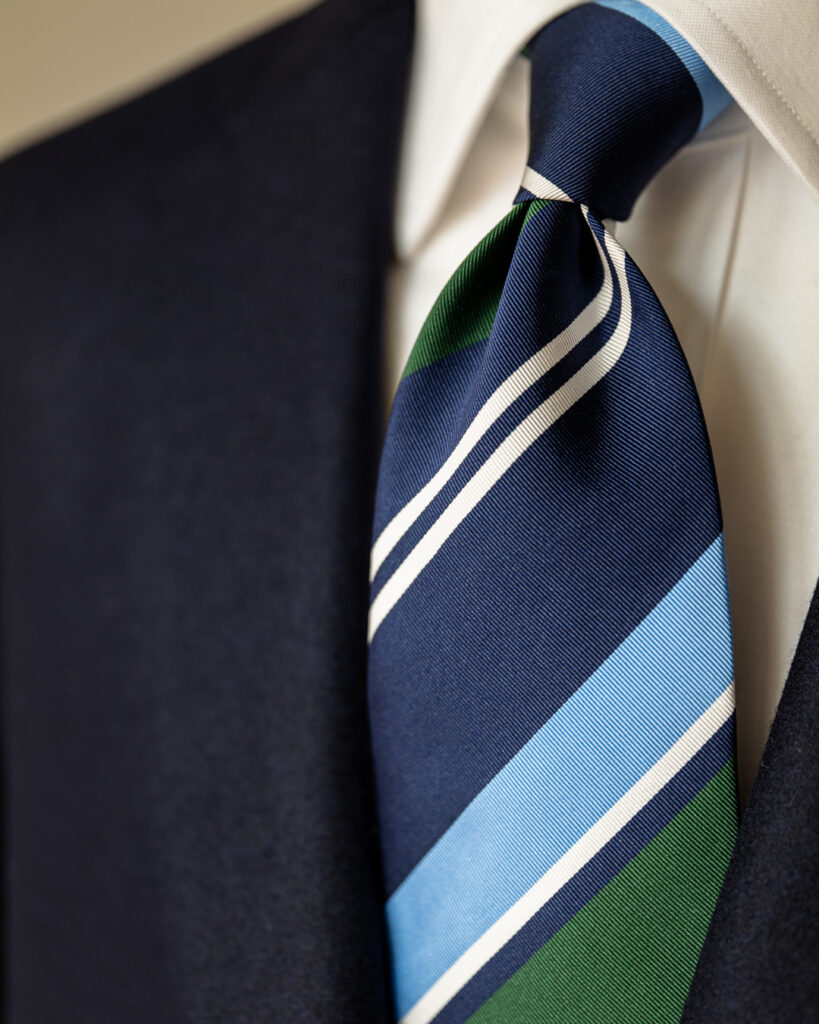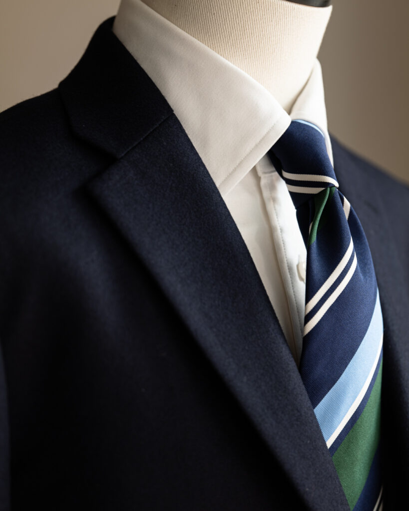 基本的な考え方は、通常のスーツと同じ。 ドレッシーなシルクタイを合わせても良いですし、今回のように少し素材感のあるネクタイを合わせても自然にまとまります。