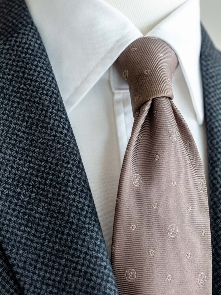 合わせたネクタイは、やや珍しいベージュゴールド。