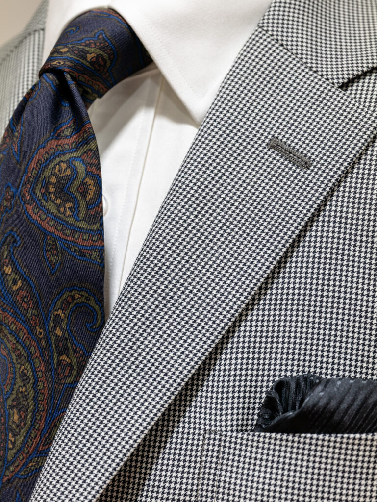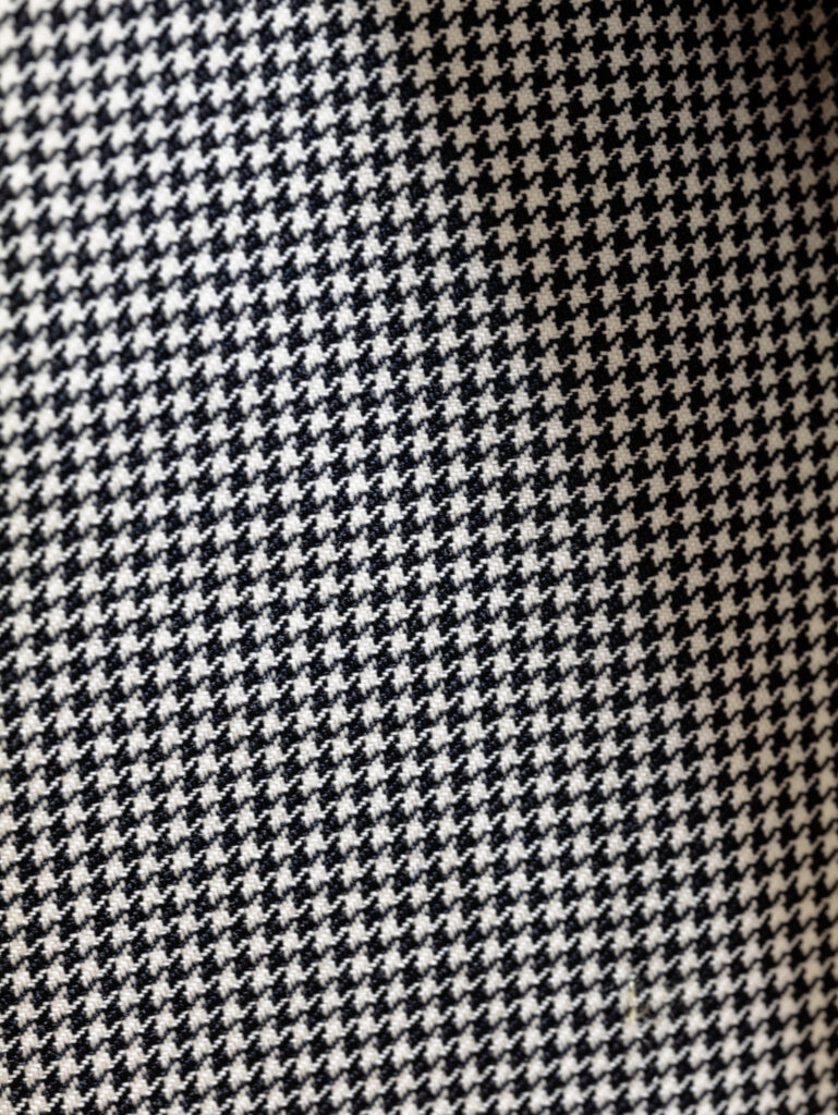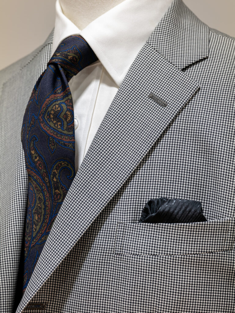 この千鳥格子は非常に細かく織られているため、近くで見ると美しい柄が確認できますが、少し離れるとほぼライトグレー無地のように見えるのが特徴です。