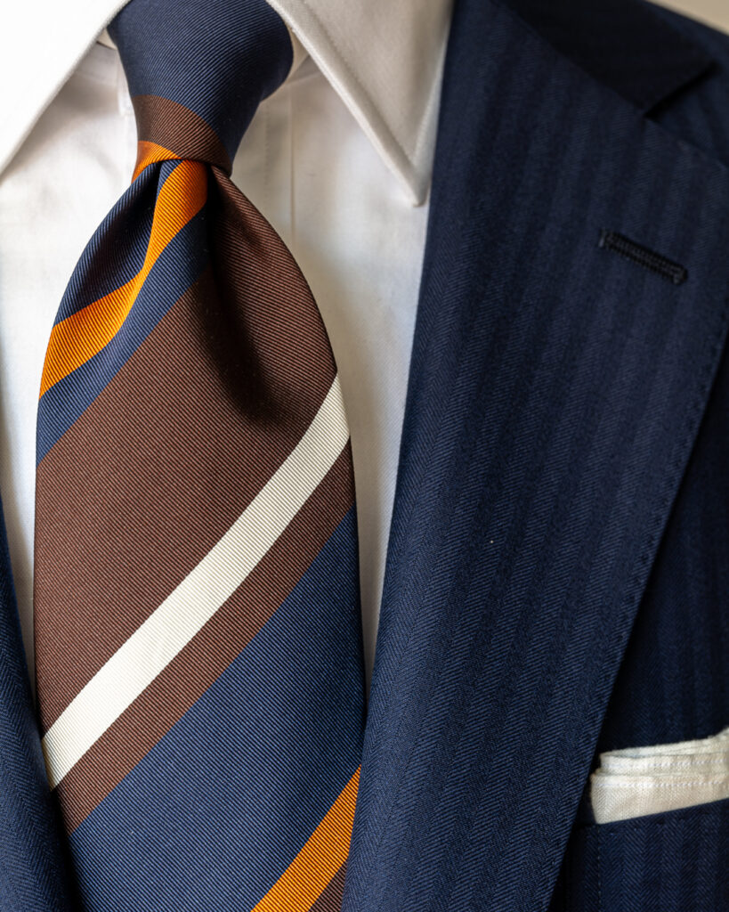 ネイビースーツと相性の良い配色で構成されたストライプタイを合わせました。