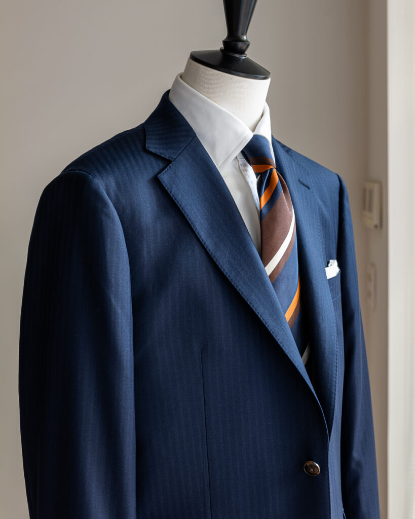 ネイビーカラーのヘリンボーンでオーダースーツを仕立てました。