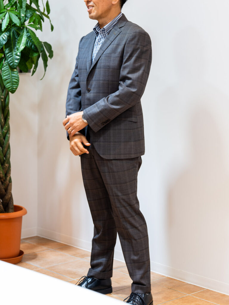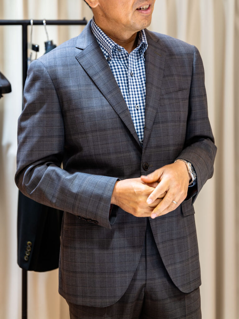 グレージュチェックのスーツに、ギンガムチェックのシャツを合わせるスタイルもおすすめです。