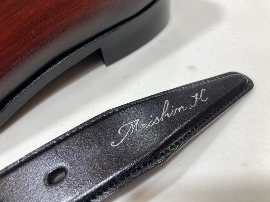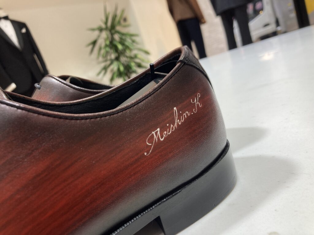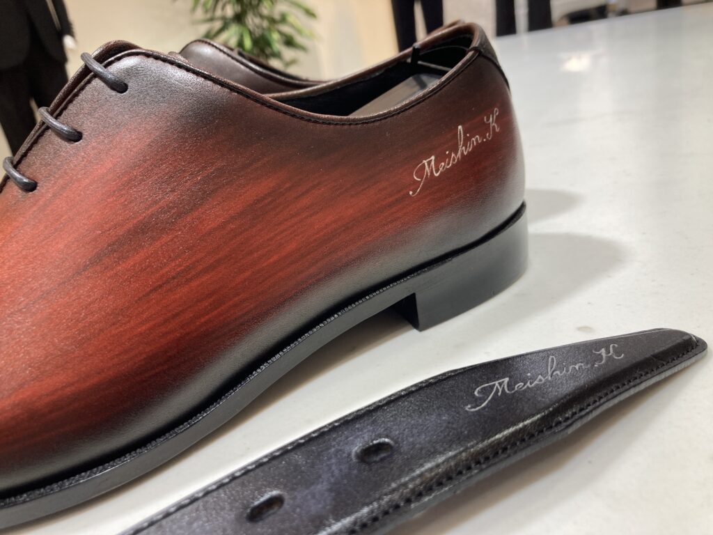 お客様のお名前を職人の手で丁寧に筆描きし、靴の仕上げ色に合わせて自然に馴染むように仕上げています。