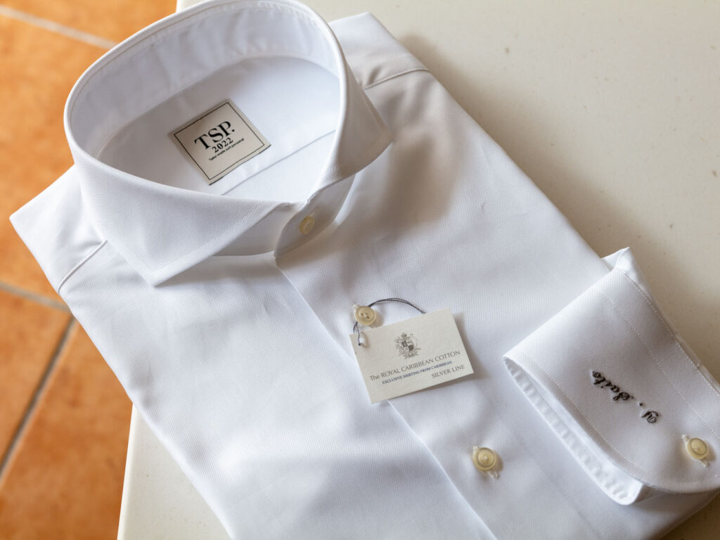 カッタウェイカラーのオーダーシャツ。