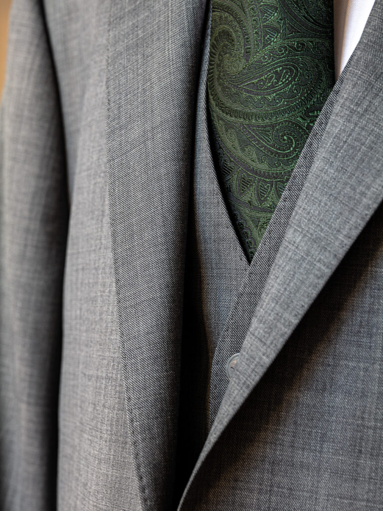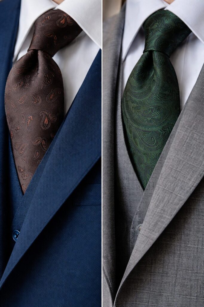 グリーンのペイズリー柄ネクタイを合わせましたが、