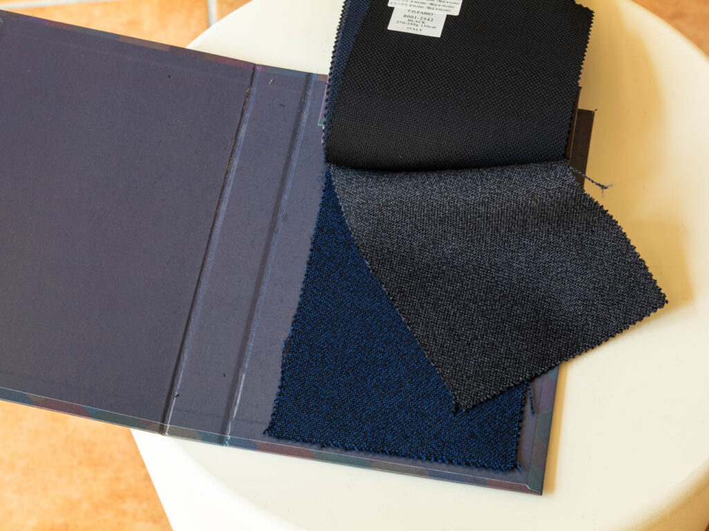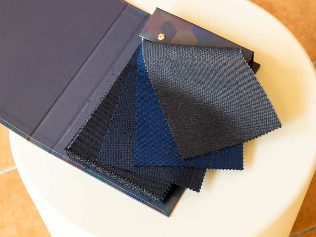 番手はSuper110’sやSuper120’sといった定番から、モヘア混やサマーキッドモヘアのシャリ感ある素材、さらにストレッチ入りの実用的なポリエステル混まで幅広くカバー。目付(生地の厚み)も240g前後の軽量な春夏向けから、500gを超える重厚なバラシア(BARATHEA)まで揃っており、シーズンや用途に応じた選択肢が豊富に用意されています。